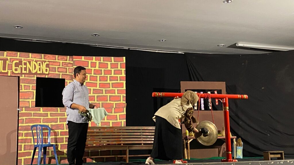 Pada panggung yang dihias menyerupai latar kampung, Prof. Ely tampak khidmat saat mengayunkan pemukul gong. Kaprodi Pendidikan Bahasa Indonesia, Dr. Memet Sudaryanto, S.Pd., M.Pd., berdiri di sisi Prof. Ely sebagai pendamping dalam prosesi pemukulan gong yang menandai dimulainya acara. Linda, salah satu panitia acara, menjelaskan alasan dipilihnya tradisi ini sebagai pembuka. “Kami memilih pemukulan gong karena maknanya kuat sebagai simbol dimulainya sebuah perhelatan budaya,” ujarnya.