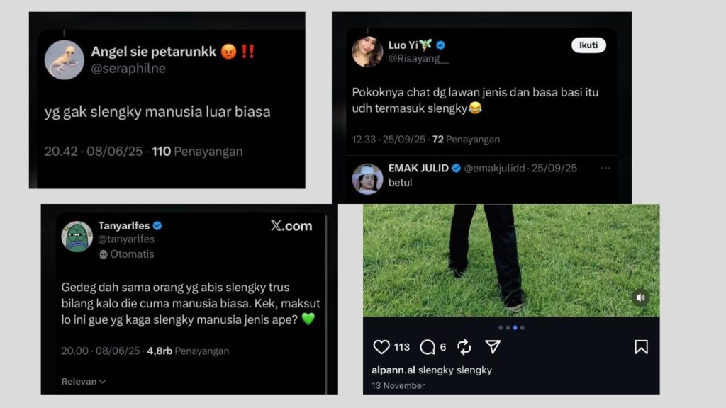 Purwokerto—Istilah slengky kini menjadi salah satu kosakata gaul yang ramai dibicarakan di media sosial. Kata ini sering muncul dalam caption Instagram, dan unggahan Twitter atau X yang membahas dinamika hubungan percintaan di kalangan pengguna internet. Meski terdengar baru dan bernuansa humor, istilah ini mengandung makna yang cukup serius, yaitu selingkuh.