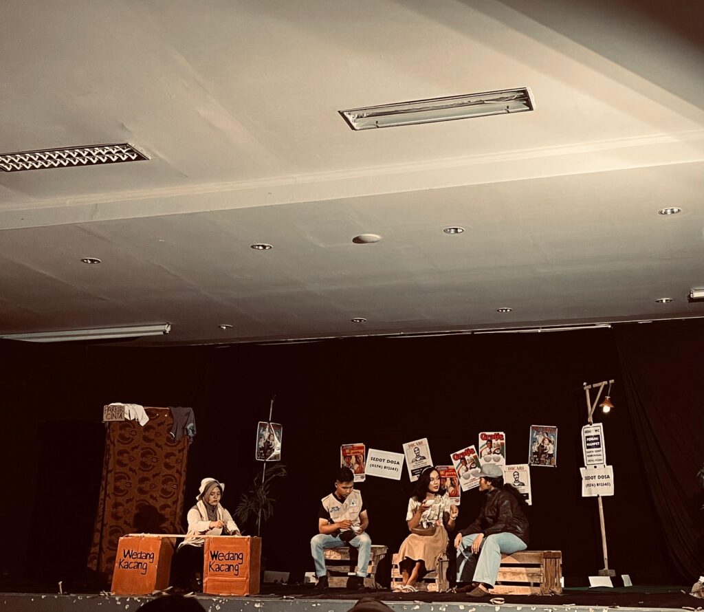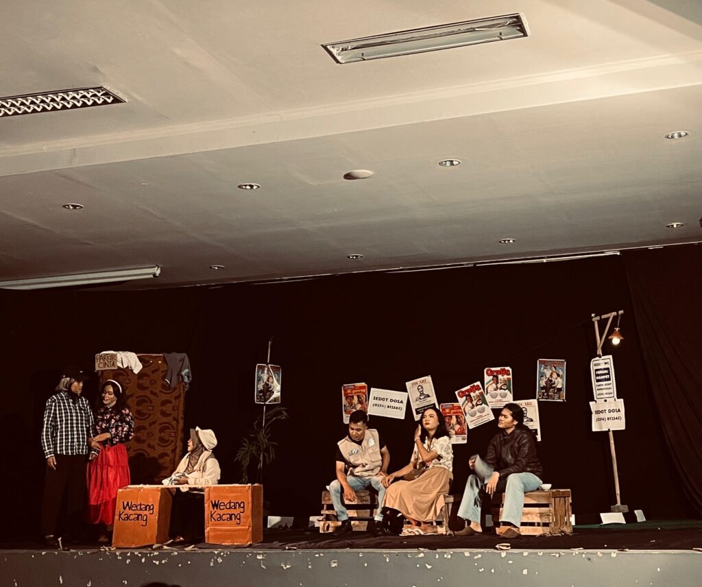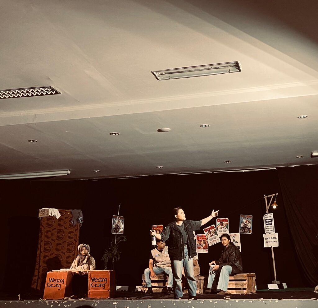 Panggung Jagat Rasa malam itu menampilkan kesederhaan yang terasa dekat dengan kehidupan. Ruang pertunjukan dihadirkan menyerupai sudut jalanan tempat cerita bermula. Sebuah gerobak wedang kacang menepi sejenak, menunggu mangkuk yang masih berpindah tangan sebelum kembali berputar melayani, lampu jalan menggantung dengan cahaya yang nyaris redup, sementara dindingnya dipenuhi tempelan poster dan selebaran usang. Detail-detail tersebut perlahan menghidupkan suasana, menghadirkan potret kehidupan masyarakat kecil yang akrab dengan keterbatasan, tetapi sarat akan cerita.