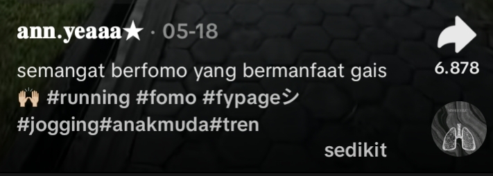 Caption dengan hashtag #pendakifomo, #fomobanget,#pelarifomo dan masih banyak lagi mencerminkan gejala Fear of Missing Out (FOMO), yaitu rasa takut tertinggal dari tren atau kegiatan sosial yang sedang populer. Alt (2018) menjelaskan bahwa FOMO dapat menimbulkan kecemasan sosial dan mendorong individu untuk tetap aktif di dunia maya agar tidak merasa tertinggal. Dalam konteks ini, bahasa gaul menjadi sarana remaja untuk menunjukkan keterlibatan mereka dalam tren sosial yang sedang berlangsung.