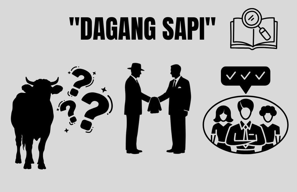 PURWOKERTO—Istilah “dagang sapi” atau “politik dagang sapi” sering muncul dalam pemberitaan setiap kali terjadi pembentukan atau perombakan kabinet. Praktik tawar-menawar kursi kabinet ini terjadi antara partai politik dan calon presiden yang dinyatakan menang, yaitu saat partai meminta jatah jabatan berdasarkan kontribusi mereka dalam memenangkan kandidat.