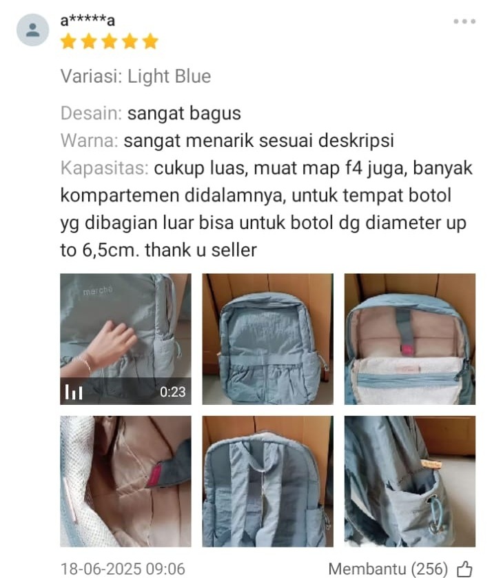 Salah satu ulasan konsumen di platform belanja menyebutkan bahwa tas ini “cukup luas, muat map F4 juga, banyak kompartemen di dalamnya”. Desain dan warna produk juga dinilai sesuai dengan deskripsi.