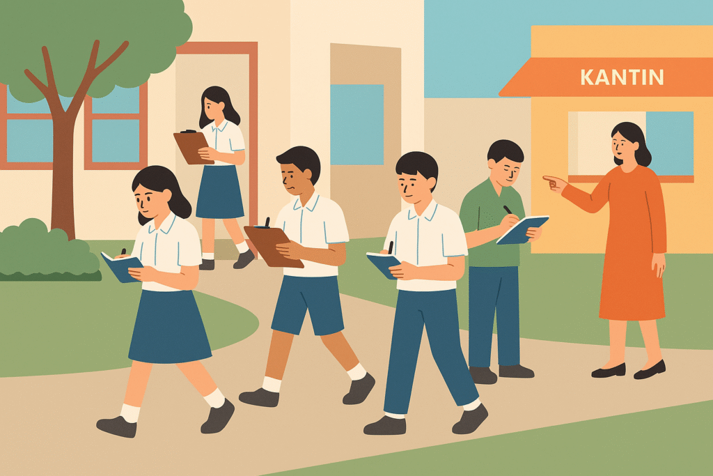 Dalam kegiatan ini, siswa dibagi menjadi beberapa kelompok kecil. Setiap kelompok menerima objek yang berbeda, lalu mencatat fakta-fakta penting, seperti ciri fisik, fungsi, kondisi kebersihan, dan potensi masalah yang mereka temukan. Setelah observasi selesai, siswa kembali ke kelas untuk mengolah data menjadi teks laporan sesuai struktur: pernyataan umum, deskripsi bagian, dan penutup.
