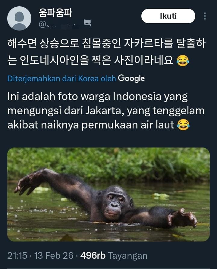Pada unggahan lain, akun yang sama kembali menyinggung sebuah foto sebagai “warga Indonesia yang mengungsi dari Jakarta akibat naiknya permukaan air laut.” Selain itu, akun tersebut turut menuliskan, “Kurasa ini adalah sentimen Asia Tenggara. Ini seperti anak SD yang menyombongkan diri karena punya lebih banyak teman.”