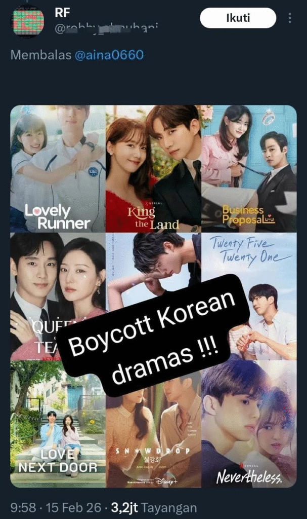 Sebagian pengguna bahkan menyuarakan protes simbolik melalui unggahan bertuliskan “Boycott Korean dramas!!!” yang merujuk pada seruan boikot terhadap produk hiburan Korea. Fenomena ini menunjukkan bagaimana perdebatan yang bermula dari isu teknis di sebuah konser dapat berkembang menjadi polemik lintas batas ketika bersinggungan dengan identitas budaya dan sentimen nasional.