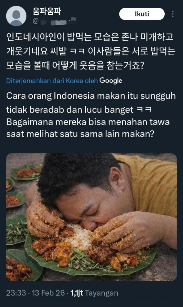 Salah satu akun X yang disamarkan sebagai @u***r*** dalam pemberitaan ini menjadi yang paling ramai dibicarakan warganet. Akun tersebut viral dan mendapat banyak balasan setelah mengunggah sejumlah komentar yang dinilai merendahkan. Dalam tangkapan layar yang beredar luas, akun itu menuliskan, “Cara orang Indonesia makan itu sungguh tidak beradab dan lucu banget. Bagaimana mereka bisa menahan tawa saat melihat satu sama lain makan?”