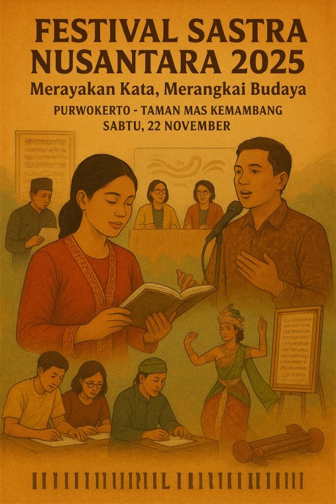 Purwokerto — Festival Sastra Nusantara 2025 resmi dibuka di Taman Mas Kemambang, Purwokerto, Sabtu (22/11). Acara yang berlangsung selama tiga hari ini menghadirkan lebih dari 300 sastrawan, budayawan, akademisi, dan komunitas literasi dari berbagai daerah di Indonesia. Mengusung tema “Merangkai Kata, Menyatukan Budaya”, festival ini menjadi ruang pertemuan lintas generasi untuk merayakan kekayaan sastra sekaligus memperkuat identitas budaya bangsa.