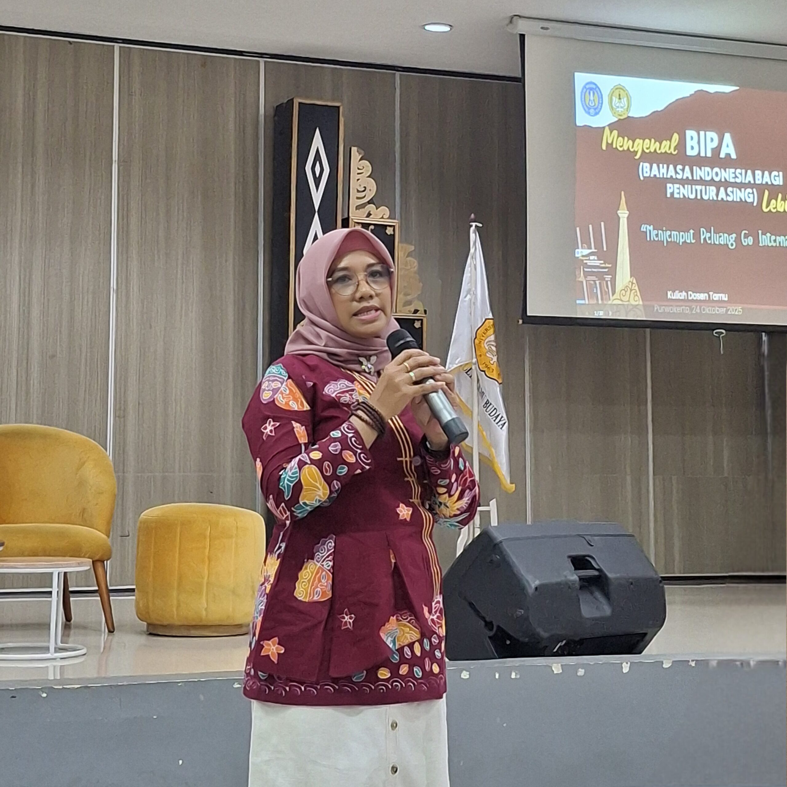 Purwokerto, 25 Oktober 2025 — Fakultas Ilmu Budaya Universitas Jenderal Soedirman (FIB Unsoed) sukses menyelenggarakan Kuliah Pakar bertema “Pembelajaran BIPA: Peluang dan Strategi Mengajar Bahasa Indonesia bagi Penutur Asing” pada Jumat (24/10) di Aula Bambang Lelono. Kegiatan ini diikuti oleh mahasiswa Program Studi Pendidikan Bahasa Indonesia angkatan 2022, 2023, dan 2024.