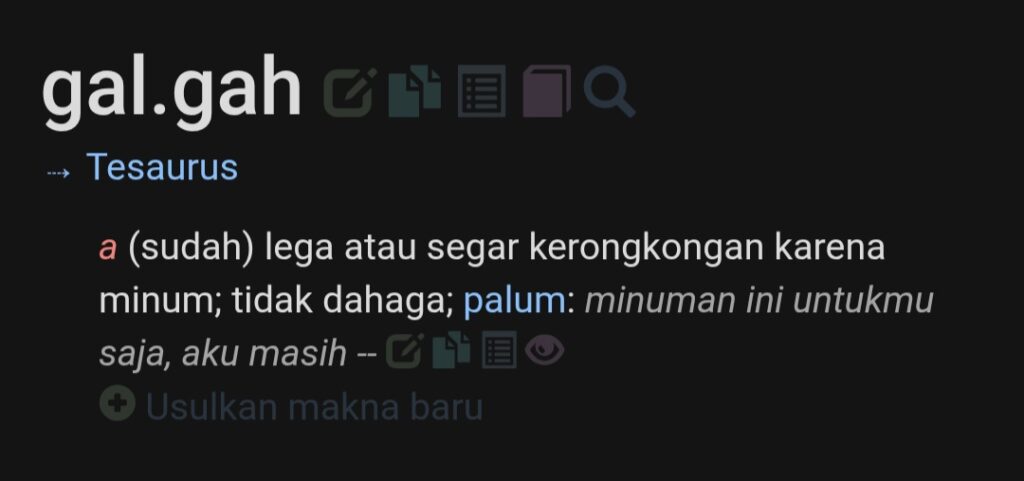 Menurut keterangan dari KBBI daring Badan Pengembangan dan Pembinaan Bahasa, “galgah” berarti sudah lega atau segar kerongkongan karena minum, tidak dahaga. Makna ini menggambarkan kondisi seseorang yang telah puas minum hingga tenggorokannya terasa segar kembali.
