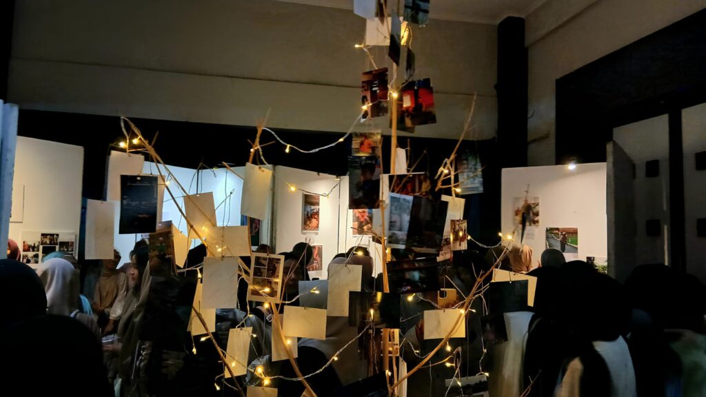 Lampu-lampu kecil yang menggantung di antara potongan foto menjadi pusat perhatian pada malam itu. Pancaran cahaya membuat foto-foto berukuran kecil di sekitarnya tampak semakin menonjol. Pada Selasa malam, 10 Desember 2025, setelah selesainya pementasan hari pertama, ruang pameran mulai dipadati pengunjung. Langkah mereka melambat ketika mendekati area instalasi utama, bergantian mencari sudut pandang terbaik untuk menikmati karya.