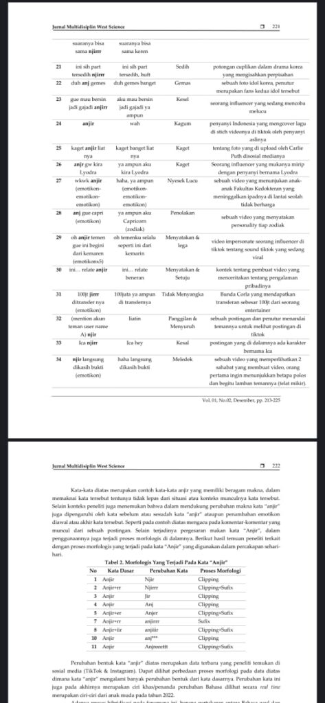 Penelitian yang sama menemukan sebelas bentuk variasi morfologis dari kata “anjir”, antara lain anjirr, anjr, anjiiir, dan anjreeet. Sebagian besar mengalami proses pemendekan (clipping) dan penambahan akhiran (sufiks). Semakin panjang bentuk katanya, semakin kuat emosi yang ingin disampaikan penutur. Hal ini memperlihatkan kreativitas berbahasa yang khas generasi Z di dunia maya.