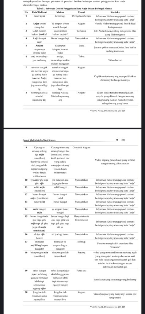 Hasil kajian yang dimuat dalam Jurnal Multidisiplin West Science tahun 2022 menunjukkan bahwa kata “anjir” telah mengalami perubahan bentuk dan makna secara signifikan. Berdasarkan analisis terhadap puluhan tangkapan layar komentar di media sosial, terdapat sedikitnya 34 bentuk pemakaian kata “anjir” yang menampilkan beragam emosi, mulai dari lucu, sedih, hingga terkejut. Variasi tersebut memperlihatkan bahwa makna kata “anjir” kini bergantung pada konteks dan situasi penggunaannya.