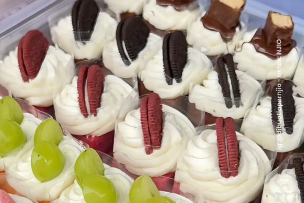 Mini cake Thailand merupakan kue berukuran kecil dengan tekstur yang lembut dan tampilan yang menarik. Biasanya kue ini dilengkapi dengan berbagai topping seperti krim, coklat, atau buah sehingga menambah cita rasa manis yang lezat. Ukurannya yang kecil membuat mini cake Thailand praktis dinikmati sebagai camilan ringan saat berbuka puasa.