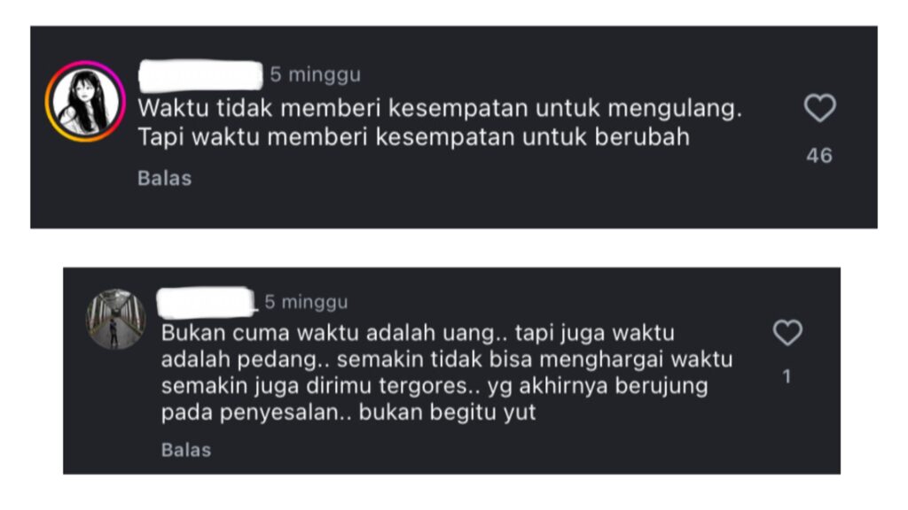 Unggahan itu mendapat beragam tanggapan dari warganet. Salah satu pengguna Instagram menulis, “Bukan cuma waktu adalah uang, tetapi waktu juga pedang. Semakin tidak bisa menghargai waktu, semakin dirimu tergores dan akhirnya menyesal.” Komentar lain menambahkan, “Waktu tidak memberi kesempatan untuk mengulang, tetapi waktu memberi kesempatan untuk berubah.” Respons tersebut memperkuat pandangan bahwa kemampuan mengelola waktu menjadi hal penting, terutama bagi mahasiswa yang memiliki banyak tanggung jawab akademik.