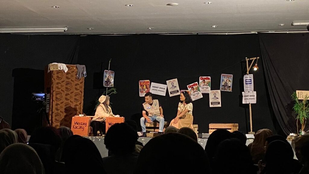 Malam itu, panggung kampus terasa seperti tikungan jalan kecil yang kita kenal di kehidupan sehari-hari. Lampu kuning redup, ada lapak wedang kacang di pojok, dan beberapa kursi kayu yang jadi tempat orang-orang singgah sebentar sebelum kembali ke urusannya masing-masing. Di tengah suasana itu, dua sosok pelan-pelan jadi pusat perhatian: Sri dan Djoko.