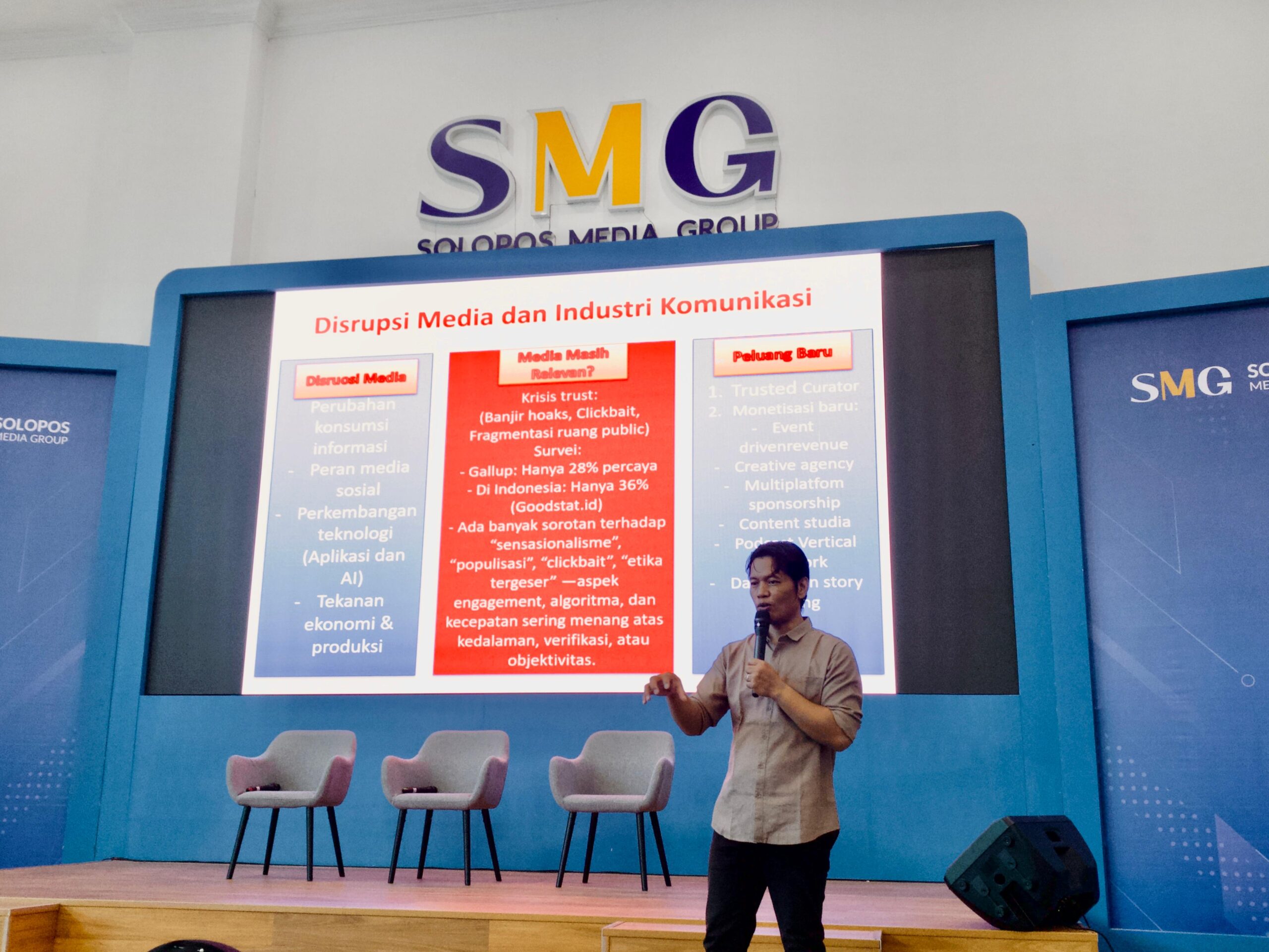 Perjalanan dimulai pada Jumat malam (28/11) dari FIB Unsoed menuju Solo. Setibanya di Solopos pada Sabtu pagi, para peserta mengikuti sesi materi mengenai “Disrupsi Media dan Industri Komunikasi”. Melalui paparan visual dan penjelasan narasumber, mahasiswa diajak memahami bagaimana media saat ini menghadapi tantangan besar seperti perubahan perilaku konsumsi informasi, dominasi media sosial, hingga tekanan algoritma yang memengaruhi penyebaran berita. Berbagai isu seperti banjir hoaks, fenomena clickbait, serta menurunnya kepercayaan publik terhadap media menjadi perhatian utama dalam sesi ini.