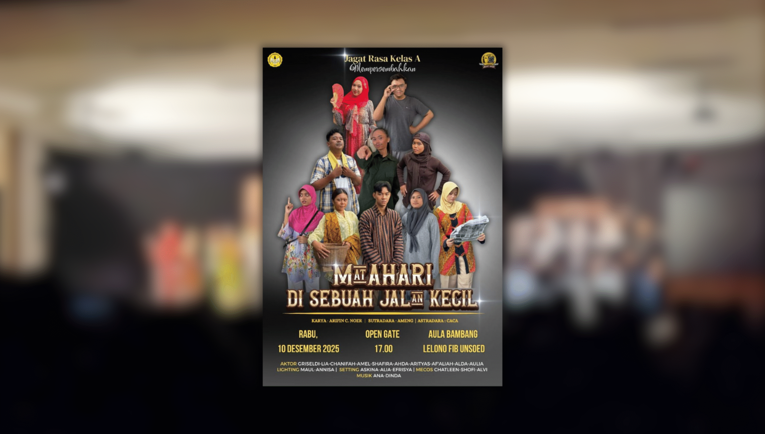 Purwokerto — Rabu malam, 10 Desember 2025, Aula Bambang Lelono FIB Unsoed tampak lebih semarak dari biasanya. Sejak open gate pukul 18.00 WIB, penonton berdatangan, memenuhi aula yang malam itu disulap menyerupai sebuah jalan kecil di depan pabrik tahu Grendeng. Sebuah warung pecel sederhana berdiri ditengah panggung dan menjadi pusat cerita dalam drama “Matahari di Sebuah Jalan Kecil” karya Arifin C. Noor dan disutradarai oleh Amelia Khairunnisa dan asisten sutradara Aisya Musyafa Najib.