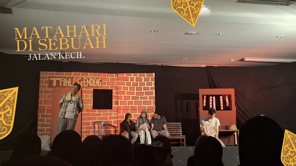 Pada pertunjukan hari pertama, Matahari di Sebuah Jalan Kecil, dekorasi panggung menggambarkan suasana kampung yang ramai. Latar berupa rumah sederhana dengan dinding bermotif bata merah, pintu kayu, jendela kecil, serta perabot seperti kursi dan meja kayu, menciptakan kesan lingkungan tempat tinggal masyarakat kelas bawah. Dekorasi ini merepresentasikan kehidupan orang-orang kampung yang bekerja di pabrik tahu, dengan aktivitas yang padat dan saling berkelindan. Kehadiran banyak elemen di panggung menggambarkan kampung sebagai ruang sosial yang hidup, dihuni oleh masyarakat dengan beragam status ekonomi, kaya dan miskin yang saling berdampingan. Bata merah yang tersusun apa adanya menandakan kehidupan yang keras dan sederhana, namun tetap kokoh. Dalam konteks ini, “matahari” dimaknai sebagai simbol harapan dan ketahanan hidup, bahwa kehangatan dan kebahagiaan masih dapat tumbuh di tengah keterbatasan ekonomi dan ruang hidup yang sempit.