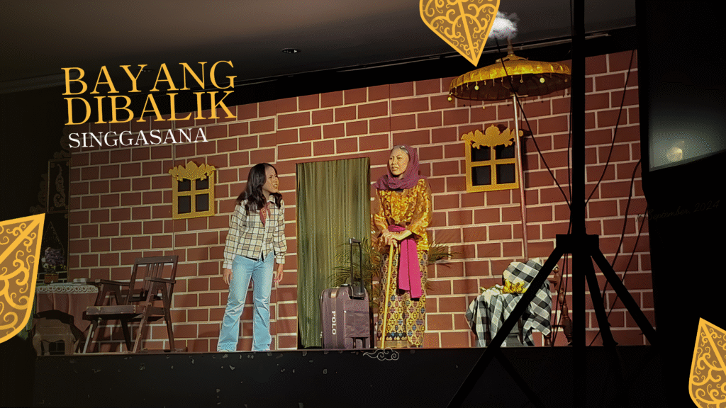 Sementara itu, pertunjukan hari ketiga, Bayang di Balik Singgasana, menampilkan dekorasi panggung dengan nuansa berbeda. Panggung menghadirkan latar khas Bali, yang tampak melalui ornamen arsitektural, ukiran, serta atmosfer ruang yang sakral dan sunyi. Properti yang digunakan tetap minimal, dengan satu kursi sebagai pusat perhatian. Kursi tersebut menjadi simbol singgasana dan kekuasaan, sementara ruang panggung yang lapang namun kosong menggambarkan kesepian dan tekanan batin di balik struktur kekuasaan. Latar Bali tidak hanya berfungsi sebagai penanda tempat, tetapi juga memperkuat kesan tradisi, hierarki, dan nilai budaya yang membingkai konflik dalam cerita. Bayangan dan bukaan sempit pada latar panggung memberi kesan keterbatasan pandangan serta sempitnya pilihan yang dihadapi para tokoh dalam lingkar kekuasaan.