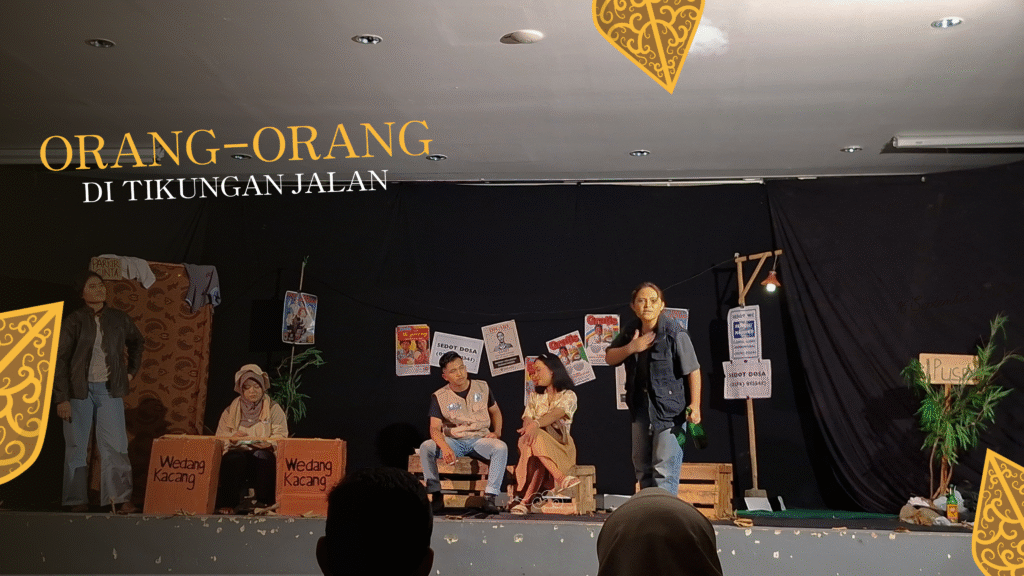 Pertunjukan hari kedua, Orang-Orang di Tikungan Jalan, menghadirkan perubahan latar yang signifikan. Dekorasi panggung menampilkan pinggiran jalan atau tikungan jalan, dengan bangku kayu, peti, serta dinding gelap yang ditempeli poster dan selebaran. Penataan properti dibuat tidak rapi dan cenderung semrawut untuk menegaskan karakter ruang jalanan yang keras dan tidak teratur. Latar ini sejalan dengan alur cerita yang menggambarkan kehidupan orang-orang pinggir jalan dengan berbagai aktivitas liar dan tidak stabil. Tikungan jalan menjadi simbol ruang persinggahan, tempat bertemunya individu-individu dengan latar belakang berbeda yang hidup dalam keterbatasan dan ketidakpastian. Poster-poster yang menempel di dinding merepresentasikan suara-suara liar, tuntutan hidup, dan kekacauan sosial, sementara bangku dan peti menjadi simbol tempat berhenti sejenak sebelum tokoh kembali menghadapi kerasnya jalanan. Dekorasi ini memperkuat tema cerita tentang konflik sosial, pilihan hidup, dan perjuangan bertahan di ruang publik yang terpinggirkan.