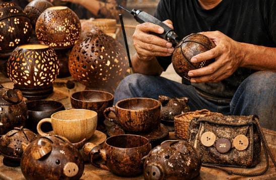Berbagai produk dihasilkan dari bahan baku batok kelapa tua, di antaranya cangkir, mangkuk, lampu hias, tas, celengan, hingga aksesori interior. Proses produksi dilakukan secara manual melalui tahapan pemilihan bahan, pembersihan, penghalusan, pembentukan desain, hingga pelapisan akhir agar lebih tahan lama dan menarik secara visual.